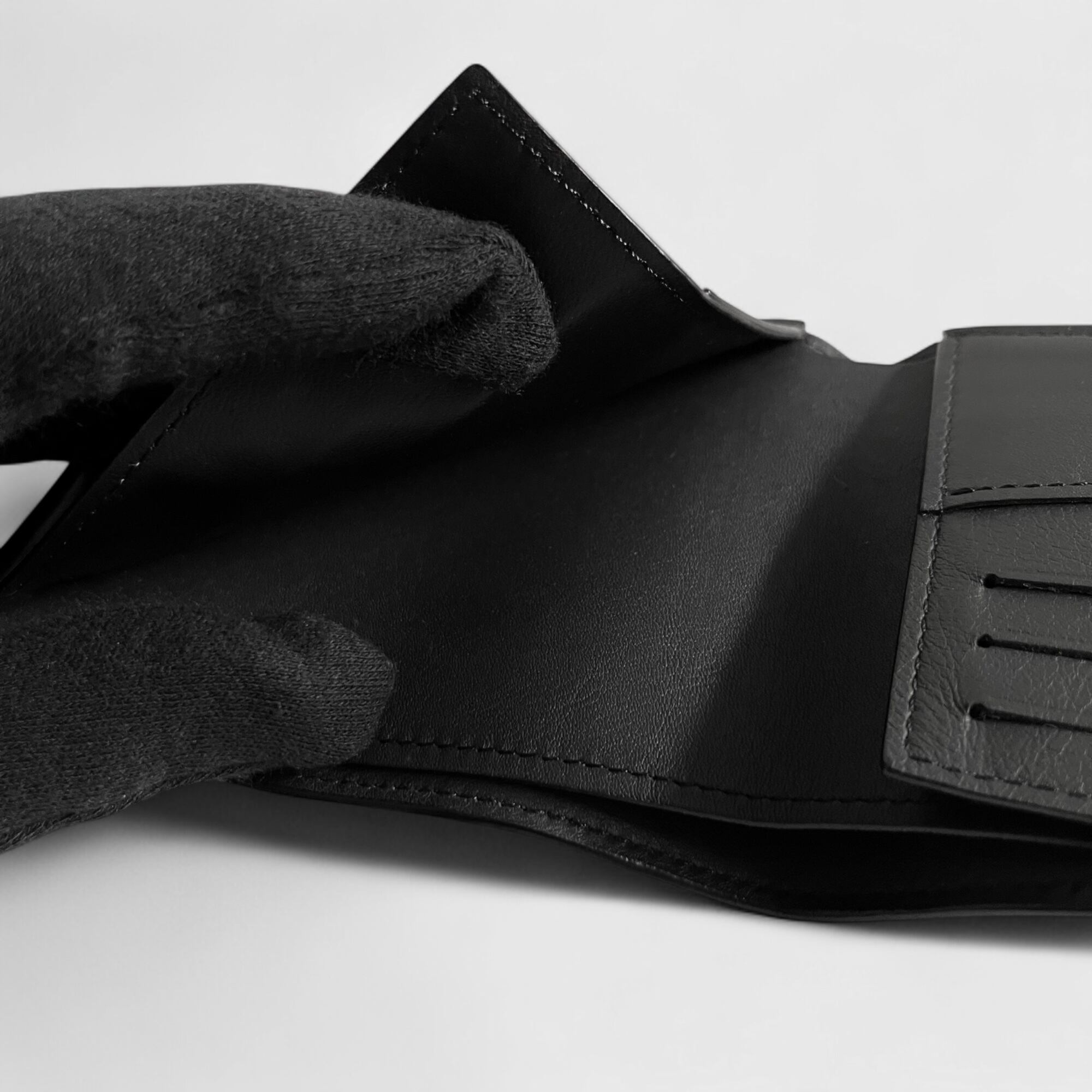 カウハイドレザーにデボス加工とオーバープリントの技法で、色褪せた風合いにアレンジしたモノグラム・パターンを散りばめた二つ折り財布です。