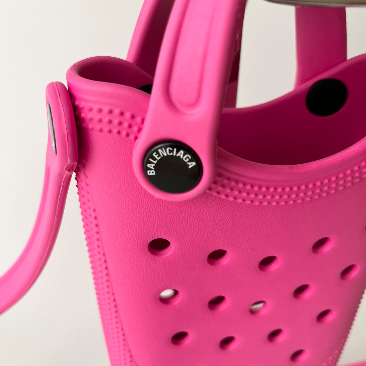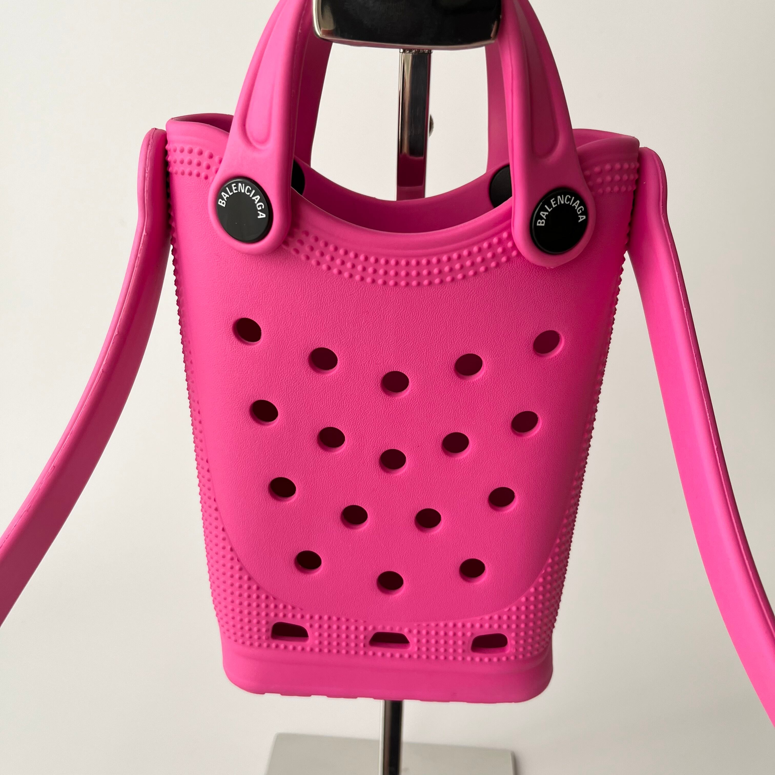 状態:目立った傷等なくきれいな状態です。バレンシアガとクロックスのコラボ品で、珍しいお品になります。流行の小さめサイズで、素材もラバー素材で使いやすいです。詳しい状態は商品画像もご参考ください。
